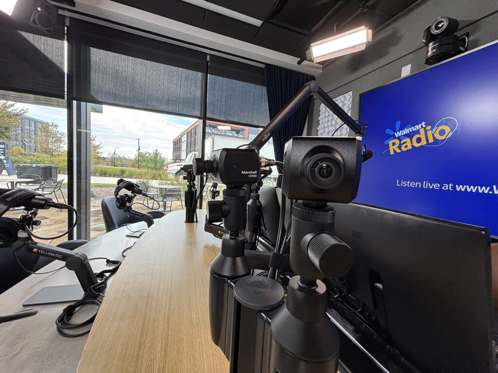 These flexible setups allow Walmart to record podcast-style interviews with celebrity guests in the radio studio as well as capture musical performances and wide shots of live bands in the main auditorium. Walmart also uses the auditorium cameras to capture its iconic “morning meetings,” company-wide pep rallies that celebrate achievements, highlight the corporate culture and recognize long-term associates.