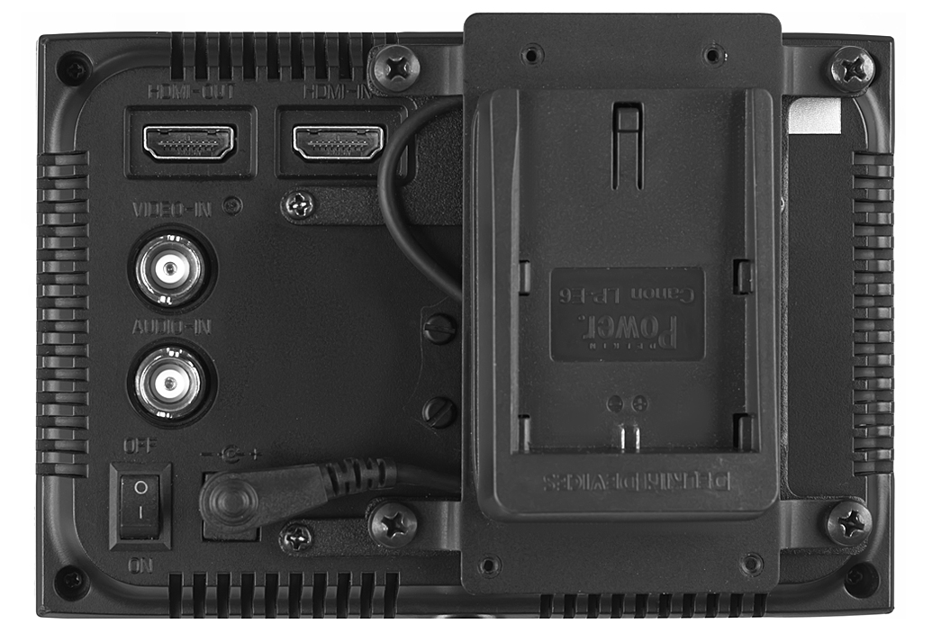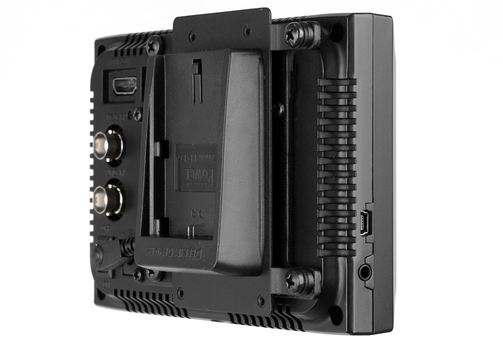 Users also have the ability to power this monitor using a standard Canon LPE6 DSLR battery. This feature allows the monitor to be powered using an existing DSLR battery for mobile on-the-go monitoring. Accessories provided include a mini-HDMI to HDMI cable, standard HDMI cable, BNC to RCA connector, cigarette lighter adapter, AC/DC power supply, hot shoe camera mount adapter, battery plate, DSLR battery and battery charger.