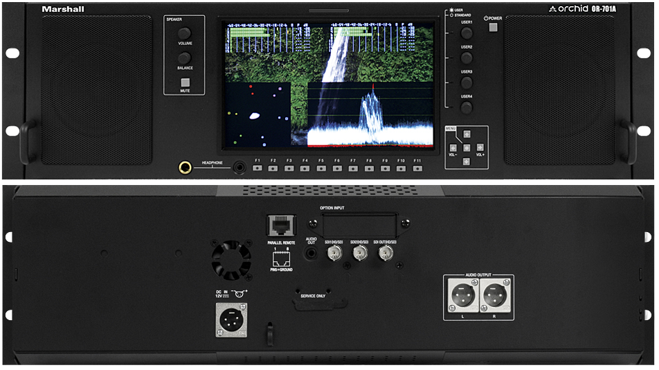 The OR-701A takes the same multi-function waveform and Vectorscope features found in Marshall's OR-702 and adds full range audio speakers and a new vertical audio bar layout for real-time audio monitoring. Any two of the sixteen audio channels being de-embedded from the HD-SDI source may be monitored through the built-in full range speakers. The same audio is available from balanced XLR outputs on the rear panel, along with the two front panel headphone jacks (3.5mm and 1/4'). Each audio output has its own level control. The front panel speakers have Volume, Balance and Mute controls that operate separately from the rear panel line and front panel headphone outputs.