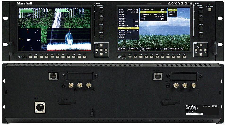 The built-in Vectorscope displays in full color and can also be displayed in three different ratios. The Vectorscope has adjustable gain from 1x to 5x. All screens are color matched at the factory and can be auto-adjusted in the field using an optional color probe system.The OR-702 will de-embed and display up to 16 channels of audio and allow the user to monitor any two channels at once through the headphone jack or rear line output jack. The 64-segment tri-color bar graph meters have user-adjustable reference levels. The OR-702 comes standard with auto-sensing HD-SDI inputs, re-clocked outputs, and an open modular slot for additional inputs.